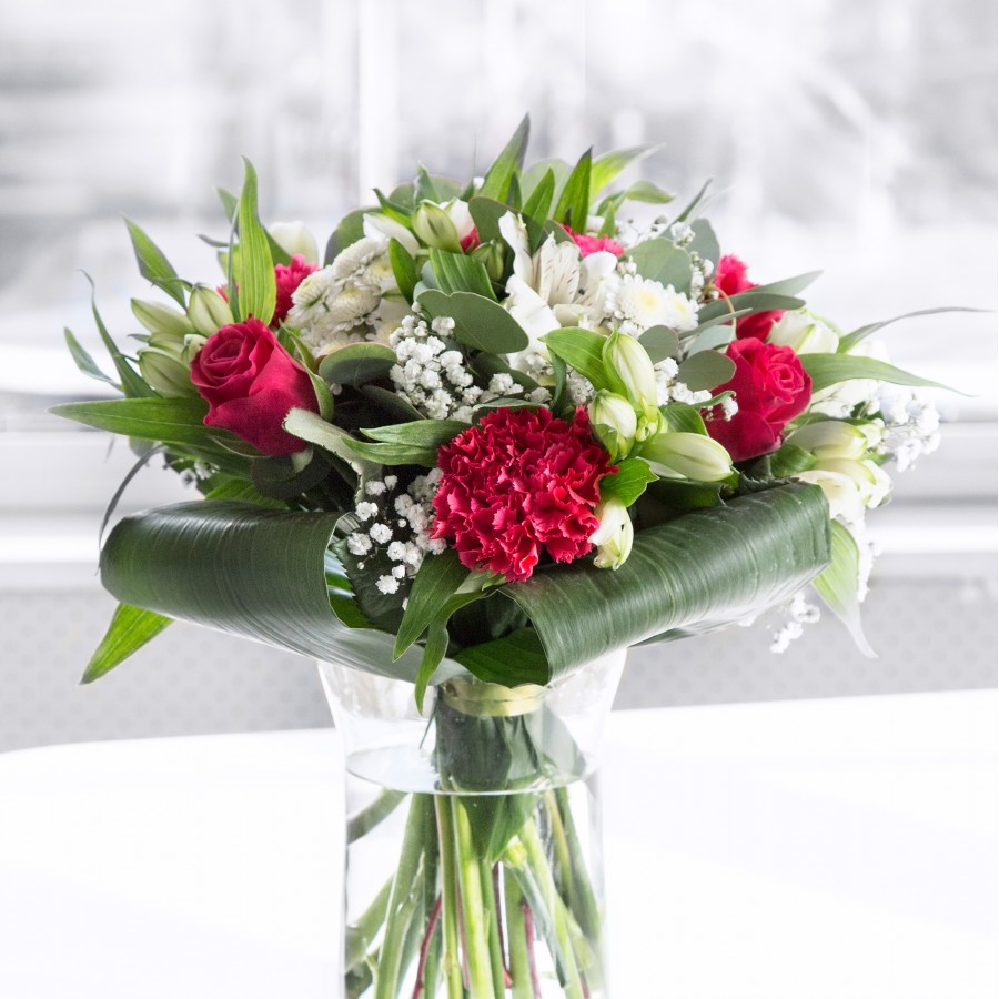 Embodying grace and elegance, our Graceful Elegance Bouquet is a masterpiece of floral artistry. Featuring sumptuous red roses and exquisite carnations, complemented by pristine white chrysanthemums and delicate gypsophila. Enhanced with white alstroemeria and rich aspidistra leaves, each flower is hand-selected to ensure ultimate freshness and quality.