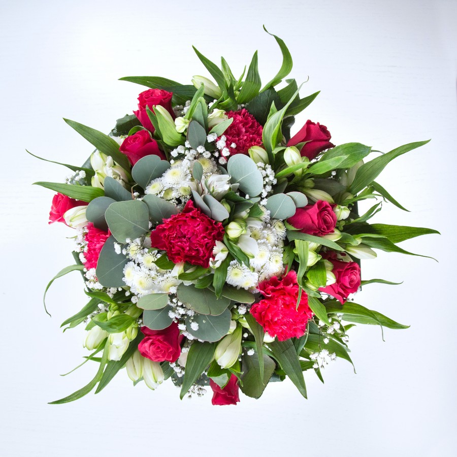 The white alstroemeria added elegance to the vibrant red roses. Truly a beautiful display.