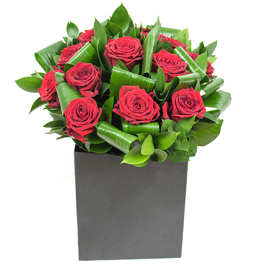 Discover the charm of our exquisite bouquet that brings sophistication and style to any home. This luxurious arrangement showcases a stunning blend of vibrant red roses, lush aspidistra leaves, and the delicate touch of ruscus — each element hand-selected at peak freshness to create a truly unique floral experience.