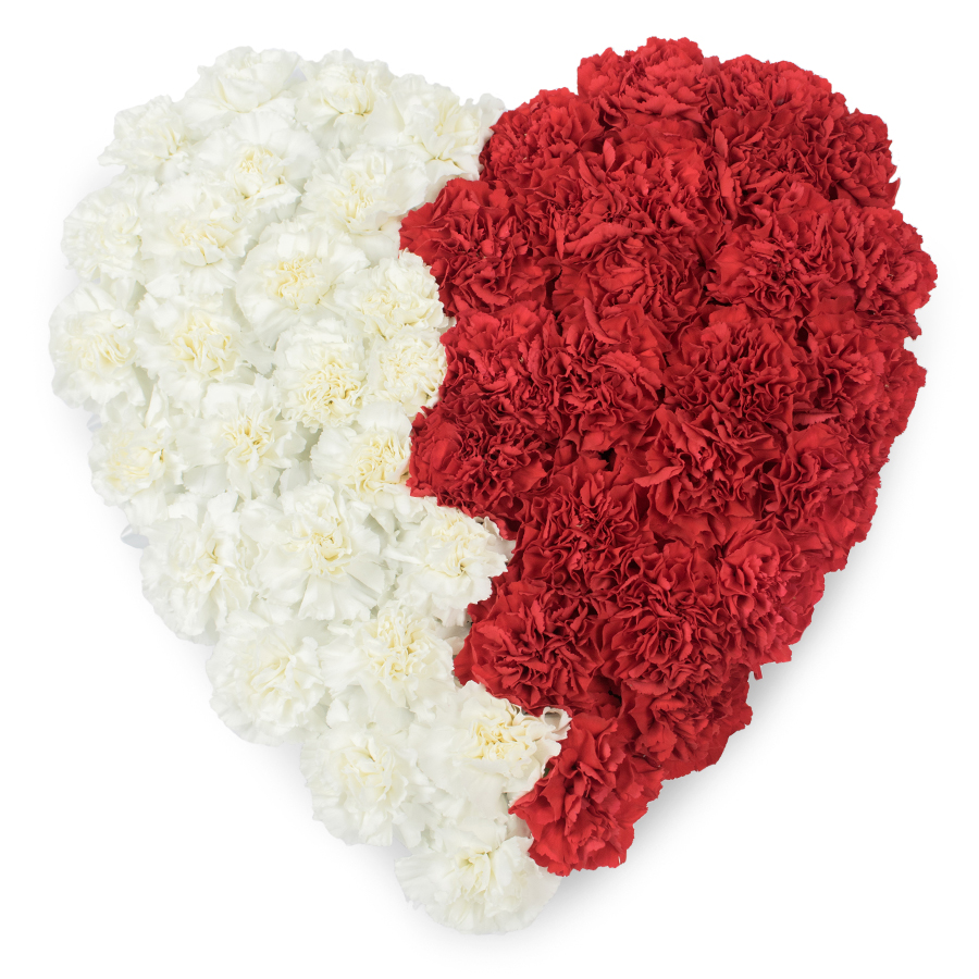 Celebrate love and sympathy with our stunning heart-shaped bouquet, expertly designed using fresh, hand-selected red and white carnations. Each flower is chosen for its vibrant color and exceptional quality, ensuring a long-lasting display of beauty.